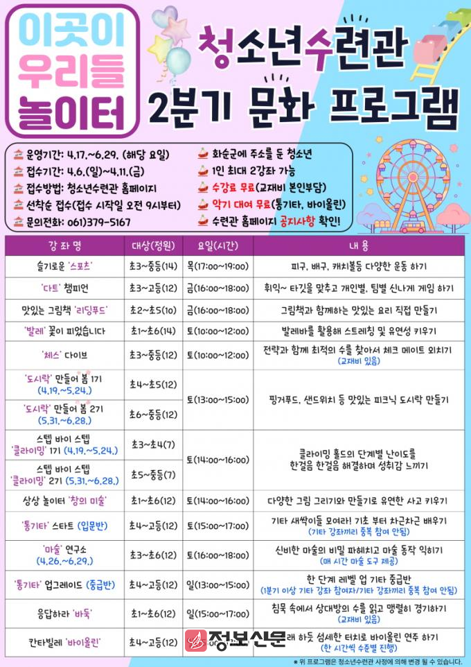 ![]() 화순군청소년수련관, ‘2분기 문화 프로그램’ 수강생 모집 |