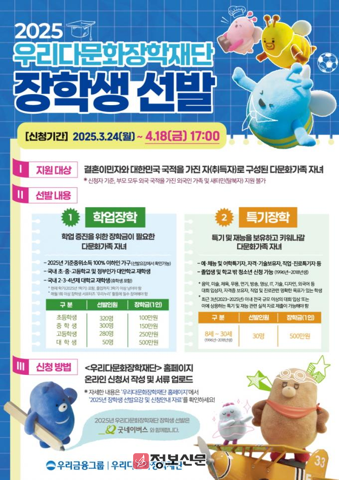 장학금 신청은 오는 3월 24일부터 4월 18일까지 진행되며, 신청을 원하는 학생은 우리다문화장학재단 홈페이지를 통해 온라인으로 신청할 수 있다.