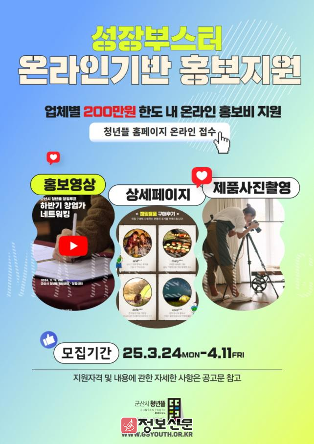 ![]() 군산시, 청년뜰 창업센터‘온라인기반 홍보지원사업’참여자 모집 |