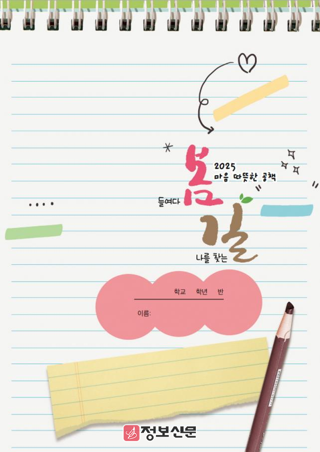 학교 현장의 의견을 반영하여 개선된 자료로 제작된‘2025 마음 따뜻한 공책, 봄 길’은 1부‘들여다 봄’(인성 키움 자료)과 2부‘나를 찾는 길’(인성 도움 자료)로 구성되어 학생 주도적 인성교육 활동을 돕는 역할을 한다.