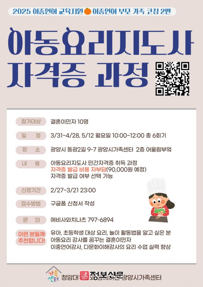 광양시가족센터는 결혼이민자를 위한 다양한 프로그램을 개발하고 지원하고 있으며 이번 아동요리지도사 교육 과정 ‘쿡쿡! 엄마랑 함께하는 요리 놀이’에 대한 자세한 사항은 광양시가족센터 홈페이지(☎061-797-6894)를 통해 확인할 수 있다.