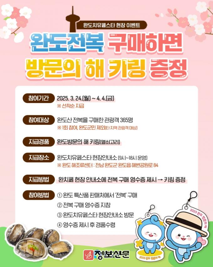 이벤트는 3월 24일부터 4월 6일까지 완도 전복을 구매하는 타 지역에서 완도를 찾은 관광객을 대상으로 진행하며, 키링은 전복 영수증을 지참하여 완도해조류센터 일원 완도치유페스타 현장 사무소(완도읍 해변공원로 84)를 방문하면 받을 수 있다.