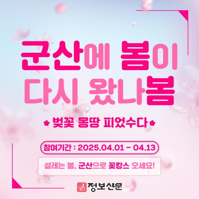 ![]() 군산시, 벚꽃사진 인증샷 ‘군산에 봄이 다시 왔나봄’이벤트 진행 |