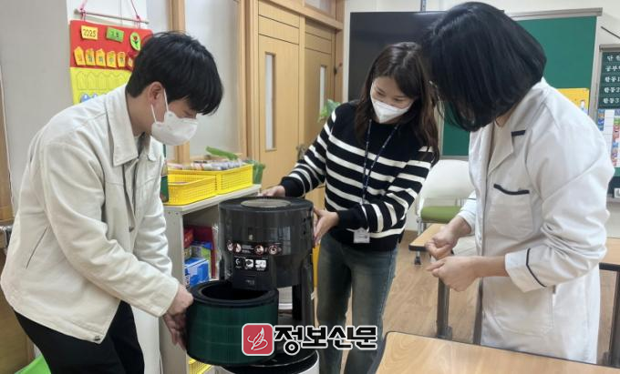 ![]() 지난 21일 건국초에서 진행된 학교 미세먼지 대응 점검에서 점검 공무원들이 공기 정화장치를 살펴고 있다.