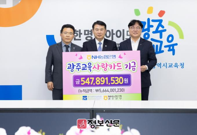 <사진설명> 24일 시교육청 상황실에서 이정선 교육감(가운데), NH농협은행 광주본부장 장재영(좌), 농협광주본부장 이현호(우) 등이 참석한 가운데 광주교육사랑카드 기금 전달식이 진행됐다.