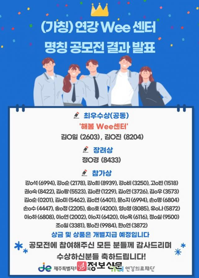 지난 2월 도민대상으로 연강의료재단과 협력하여 병원형 위(Wee) 센터 명칭 공모에 총 178명이 응모하였고 최종‘해봄 위(Wee) 센터’선정되었다.