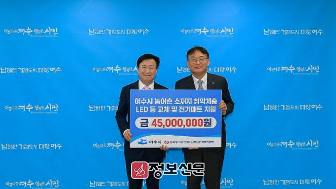 ![]() 여수시(시장 정기명)는 최근 한국동서발전㈜ 신호남건설추진본부(본부장 김태규)가 농어촌 지역 취약계층을 위해 4,500만 원 상당의 ‘LED 전등 교체 및 전기매트’ 후원증서를 전달했다고 밝혔다.