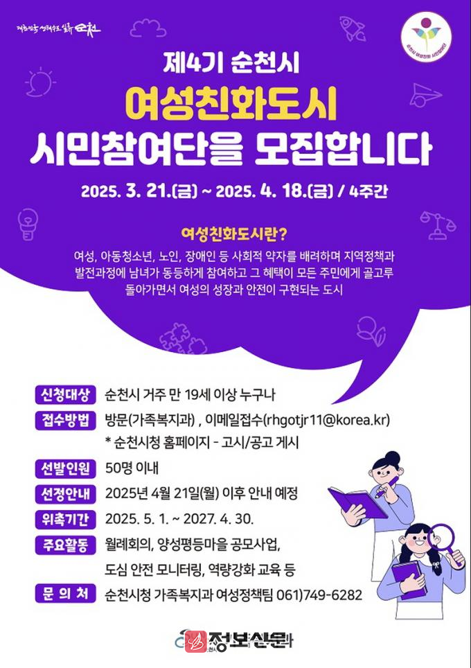![]() 순천시, 제4기 여성친화도시 시민참여단 모집 |