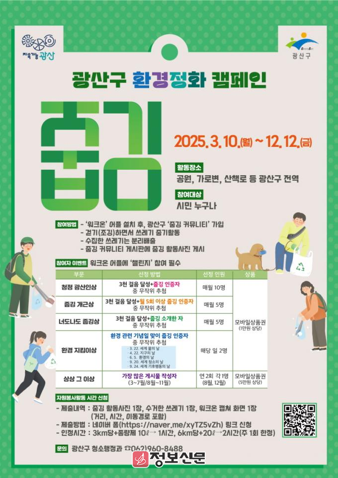 캠페인은 12월 12일까지 누구나 참여할 수 있으며, 참여 희망자는 광산구 걷기 앱인 ‘워크온’을 설치하고, 광산구 줍깅 커뮤니티에 가입한 후 게시판에 줍깅 활동 인증 사진을 올리면 된다.