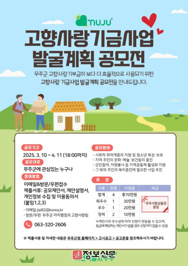 최우수로 선정된 1명에게는 무주사랑상품권 30만 원을, 우수 1명에게는 20만 원, 장려 2명에게는 각각 10만 원을 지급할 예정이다.