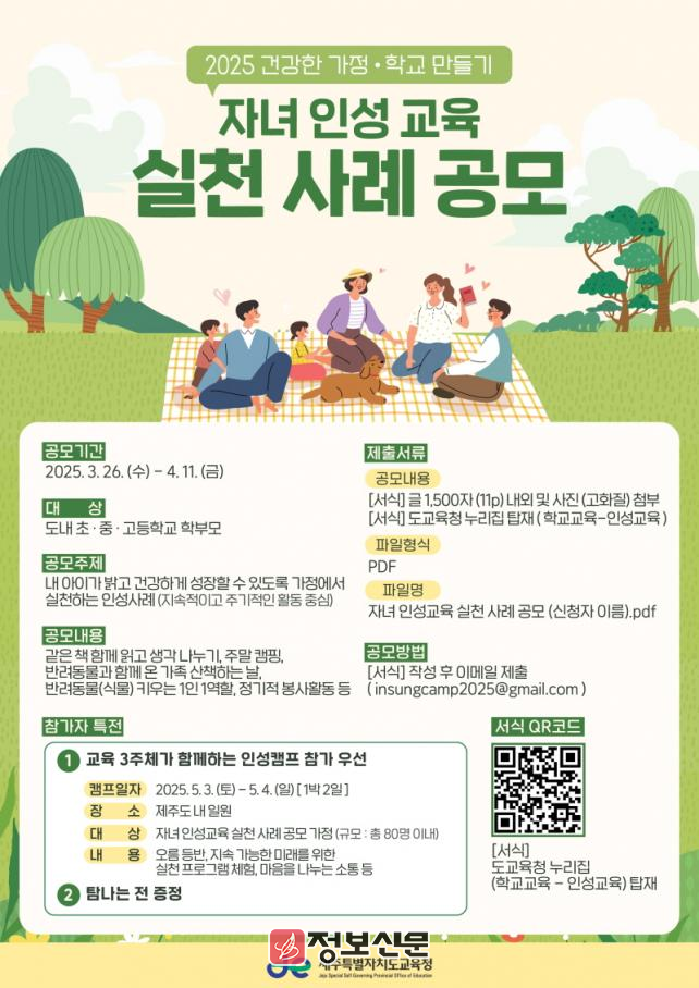 ![]() 제주특별자치도교육청, 2025 자녀 인성교육 실천사례 공모 실시 |