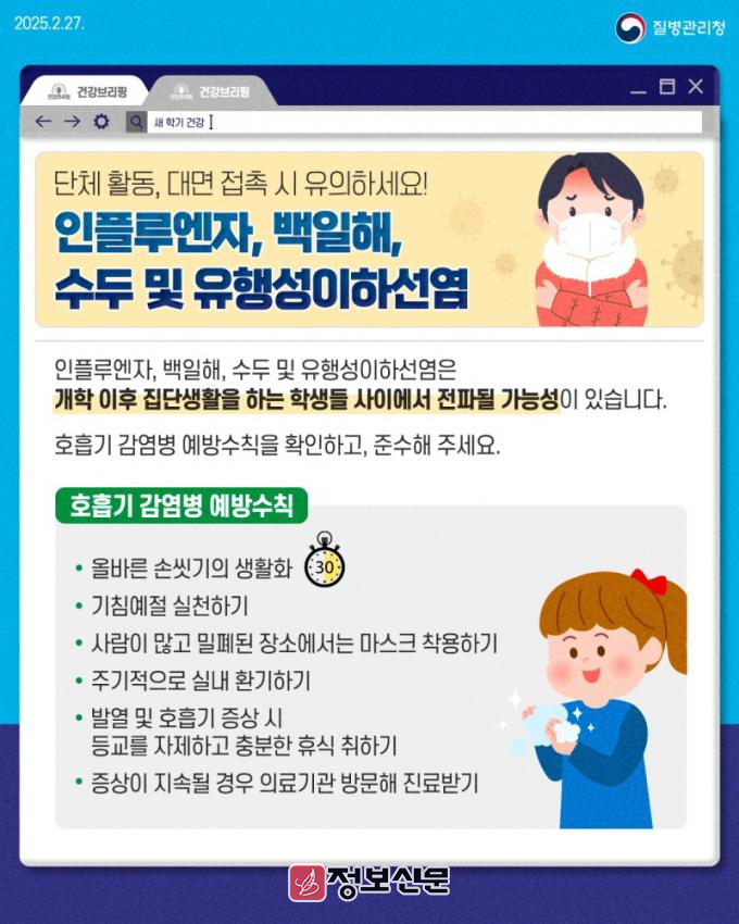 호흡기 감염병은 연례적으로 학기 중 발생이 증가했다가 방학 기간 감소하는 특성을 보이므로 신학기 실내 공동생활을 하는 학령기 소아와 청소년 감염 예방에 주의가 필요하다.