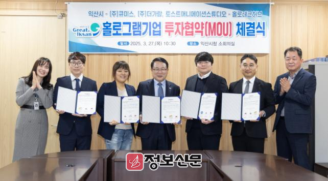 익산시는 27일 시청 소회의실에서 ㈜큐미스, ㈜더가람, 토스트 애니메이션 스튜디오 등 홀로그램 기업 3곳과 투자협약을 체결했다. 이날 협약식에는 정헌율 익산시장과 기업 대표, 김재훈 홀로테크허브 센터장 등이 참석했다.