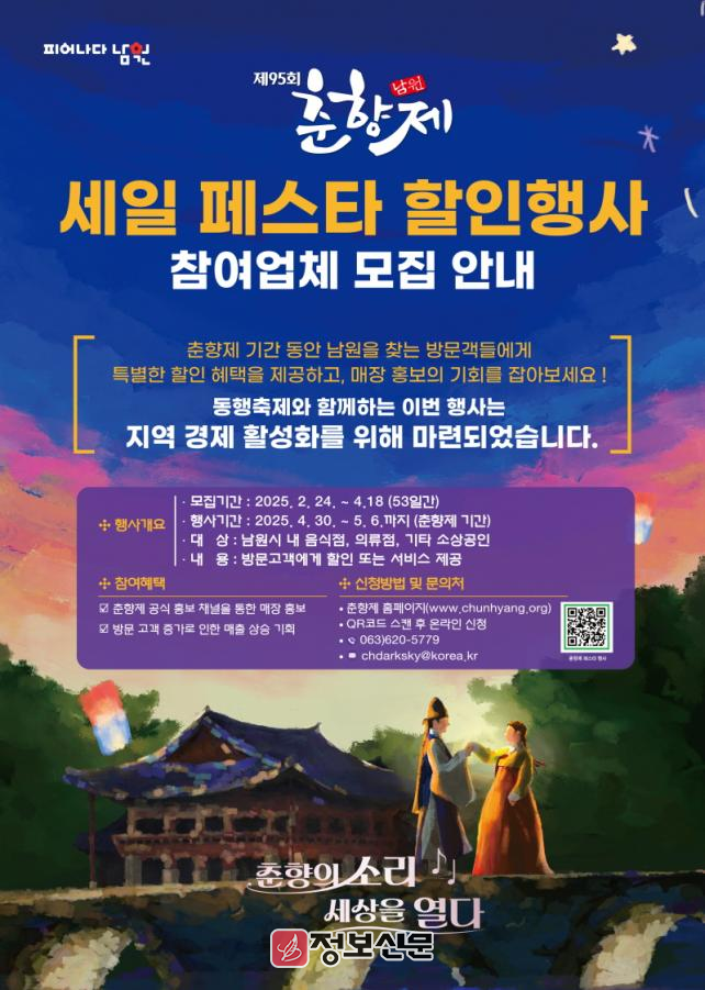 특히, 이번 ‘동행 페스타’는 참여 업소들이 춘향제의 성공적인 운영에 직접 기여하는 기회가 될 것으로 기대된다. 참여하는 업체들은 지역경제 활성화와 더불어, 남원을 찾은 관광객들에게 좋은 인상을 남길 수 있는 기회가 될 것으로 보인다.