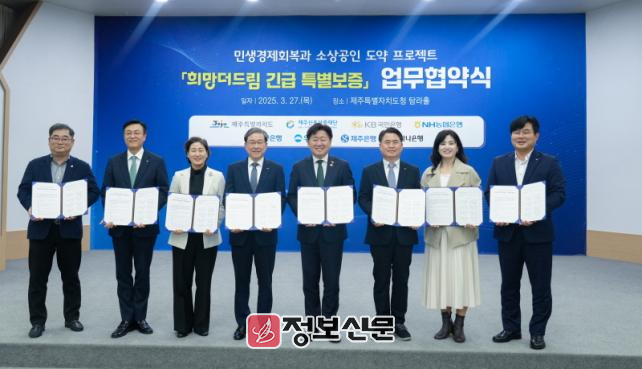 제주도는 27일 오후 4시 제주도청 탐라홀에서 제주신용보증재단, 국민·농협·신한·우리·제주·하나은행 등 6개 금융기관과 민생경제 회복과 소상공인 도약 프로젝트인‘희망더드림 긴급 특별보증’을 위한 업무협약을 체결한다.