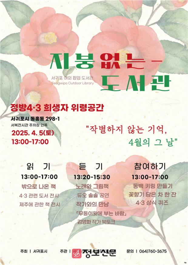 서귀포시 관계자는 “책과 예술을 통해 4·3의 아픔을 기억하고, 이를 공유하는 자리를 마련하고자 이번 행사를 기획했다”라며“많은 시민이 함께해 4·3의 의미를 되새기고, 평화와 화해의 가치를 나누는 시간이 되길 바란다.”라고 밝혔다.
