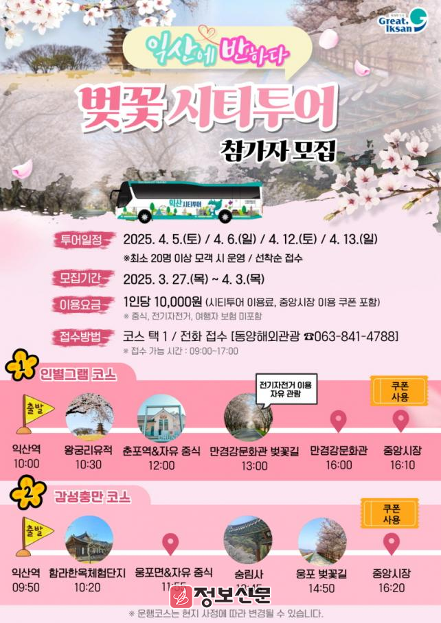 이번 시티투어는 익산의 아름다운 벚꽃 명소와 전통시장을 연계해 구성된 특별 노선으로, 봄 정취와 지역 상권을 동시에 즐길 수 있다. 참가비는 1만 원이며, 참여 신청은 오는 4월 3일까지 전화(063-841-4788)로 선착순 접수한다.