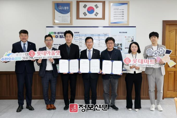 광산구는 28일 수완지구 롯데쇼핑몰 입점 업체인 롯데아울렛 광주수완점(점장 최종헌), 롯데마트 수완점(점장 우종욱)과 ‘수완호수공원 관리개선을 위한 업무협약’을 체결했다고 밝혔다.