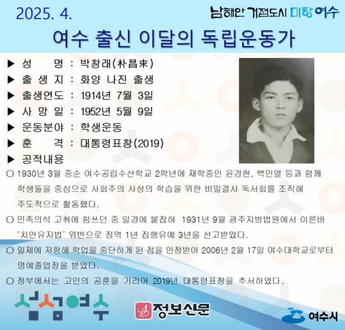 ![]() 여수시, 4월의 독립운동가 화양 나진 태생 ‘박창래 선생’ 선정 |