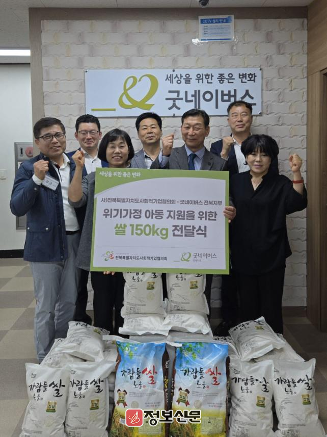 이날 전달식에는 굿네이버스 전북지부 김윤주 지부장, 사)전북특별자치도사회적기업협의회 이재배 회장 및 임원진이 참석했으며, 전달된 쌀은 전북 지역 내 저소득 및 위기가정에 지원 예정이다.