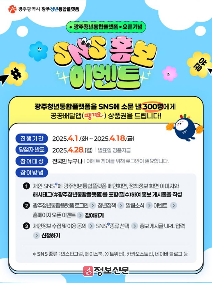 광주시는 광주청년통합플랫폼의 이용자 확대와 인지도 향상을 위해 1일부터 오는 18일까지 사회관계망서비스(SNS) 홍보 이벤트를 진행한다. 이벤트 참가자 중 추첨을 통해 300명(3만원권 30명, 1만원권 270명)에게 공공배달앱 ‘땡겨요’ 상품권을 지급하며, 28일 광주청년통합플랫폼에서 당첨자를 발표할 예정이다.