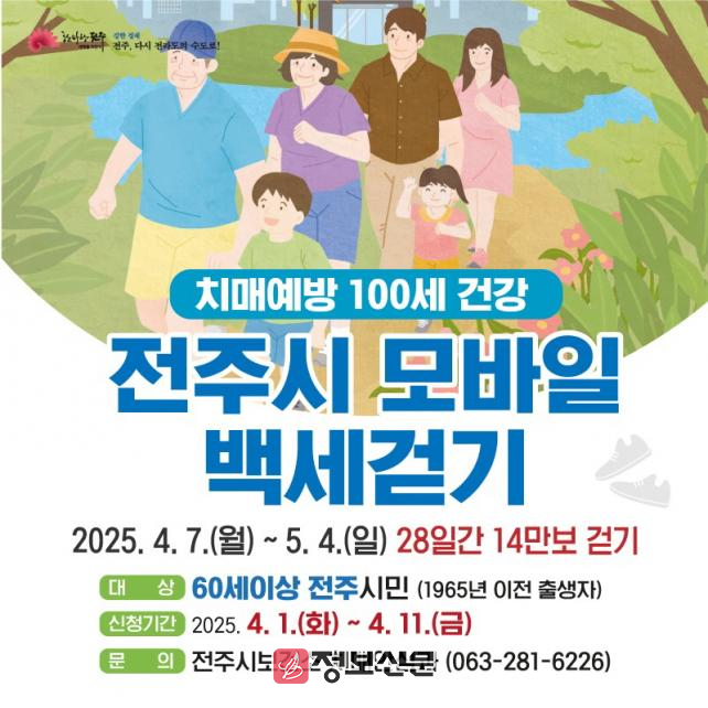 또한, 전주시보건소 치매안심센터는 60세 이상 전주시민을 대상으로 ‘치매예방 인식개선 100세까지 건강하게, 모바일 백세 걷기’ 챌린지도 함께 진행한다. 백세 걷기 챌린지는 목표걸음수 도전을 통해 어르신들의 신체활동을 촉진하고 치매예방의 중요성을 널리 알리기 위해 올해 처음으로 마련된 온라인 걷기 행사이다.