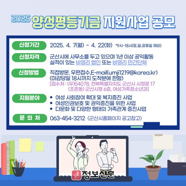 ![]() 군산시, 2025년 양성평등기금 지원사업 공모 |