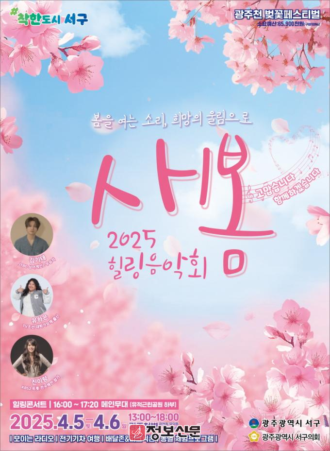 이번 힐링음악회는‘봄을 여는 소리, 희망의 울림으로’라는 주제로 광주의 대표 벚꽃 명소인 광주천변에서 시민들에게 음악과 쉼을 통해 힐링의 시간을 제공할 예정이다. 특히 올해는 경기 침체 장기화로 어려운 시기를 보내고 있는 소상공인을 위로하고 격려하는 자리로 의미를 더했다.