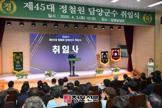정철원 군수는 취임사를 통해 “담양의 발전과 변화를 위해 저를 선택해 주신 만큼 낮은 자세와 무거운 책임감으로 군정에 임하겠다”라며 “일평생 담양에서 살아온 경험과 지역 곳곳에서 민원을 해결한 3선 의원의 노하우를 살려 담양의 새로운 길을 열겠다”라는 포부를 전했다. 이어 “행복한 삶이 있는 담양을 위한 오담(五潭) 행복 약속을 드리겠다”라며 군정 전반의 청사진을 제시했다.