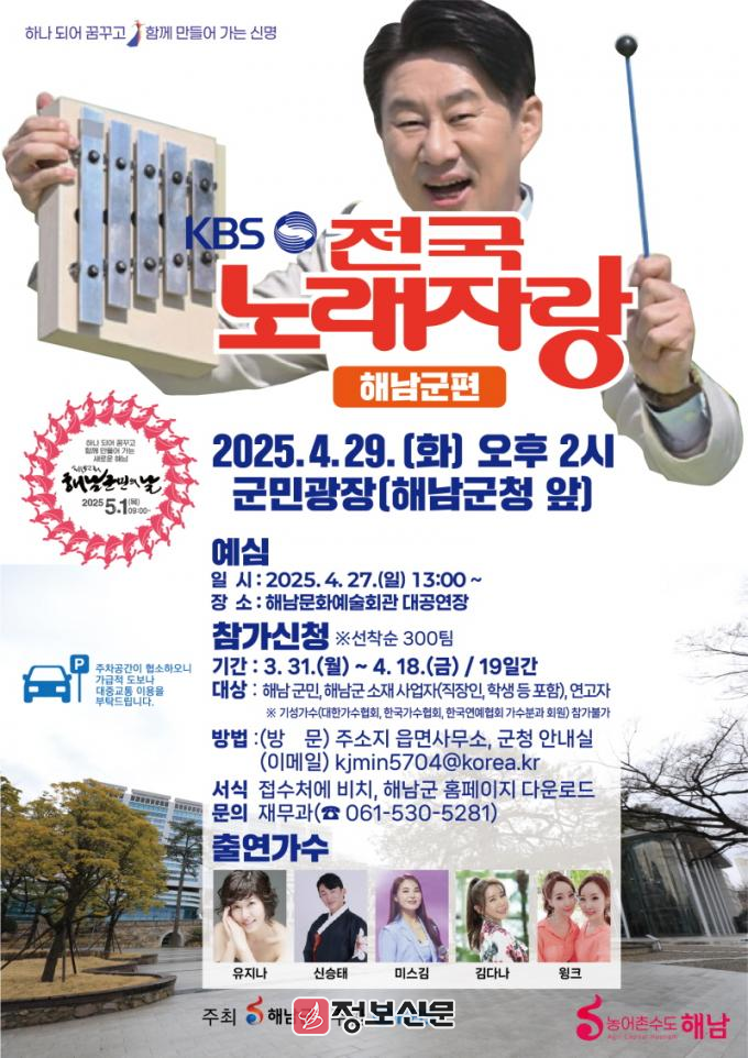 특히, 이와 관련해 전국노래자랑의 주인공인 일반 출연자 예심 접수가 시작됐다. 예심참가는 기성 가수를 제외한 군민 누구나 신청 가능하며 오는 4월 18일까지 각 읍면사무소, 군청 안내실을 직접 방문 신청하거나 해남군 누리집 군정 알리미에서 신청서를 내려받아 이메일(kjmin5704@korea.kr)로 접수 가능하다. 또 이번 예심은 오는 4월 27일 오후 1시 해남문화예술회관 대공연장에서 진행되며 1~2차 예심을 통해 15팀 내외로 본선 진출자를 선발할 계획이다.