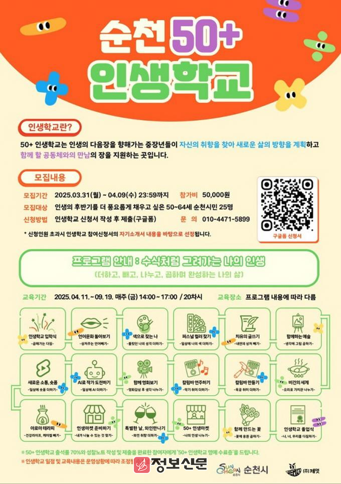 ![]() 순천시, 신중년 새로운 세상 만나기, 순천 「50+인생학교」 수강생 모집 |