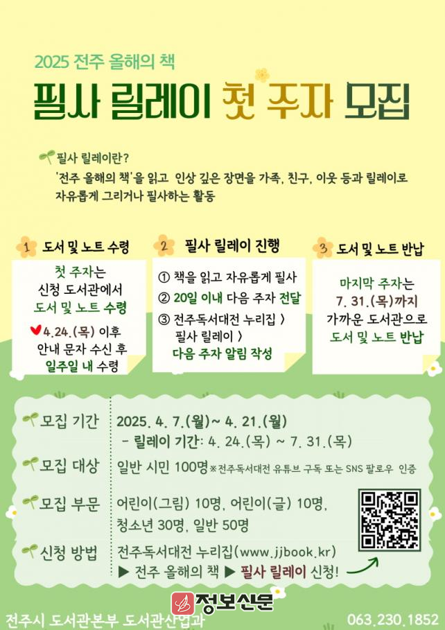 ![]() 전주시, 2025 전주 올해의 책 필사 릴레이 첫 주자 공개모집 |