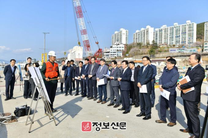 이날 정 시장은 간부 공무원 30여 명과 국동항을 방문, 시공사로부터 사업 추진 현황과 향후 계획을 보고받은 후 경도에 입도해 공사 현장을 살폈다.