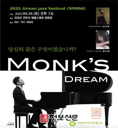 주지 대진 스님은 “천은사의 봄밤, 자연과 음악이 어우러지는 ‘Monk’s Dream’은 참가자에게 깊은 울림을 전할 것”이라고 많은 관심과 동참을 당부했다. 061)781-4800
