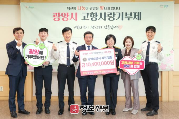 정인화 광양시장은 “시민들의 안전을 위해 헌신하고 계신 소방서 직원들이 3년 연속으로 고향사랑기부제에 동참해준 데 진심으로 감사드린다”며 “따뜻한 마음을 모아 전해주신 기부금은 광양의 발전과 지역민의 안전을 위해 소중히 사용하겠다”고 말했다.