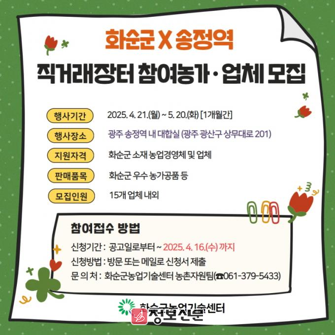 ![]() 화순군, 송정역 고향뜨락 직거래장터 참가자 모집 |