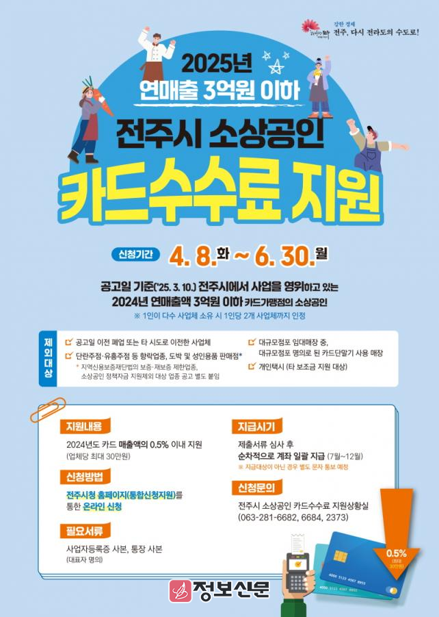 시는 8일부터 오는 6월 30일까지 전주시 소상공인을 대상으로 2024년도 카드매출액의 0.5% 이내, 업체당 최대 연간 30만 원까지 지원하는 ‘2025년 소상공인 카드수수료 지원사업’ 신청을 접수한다.