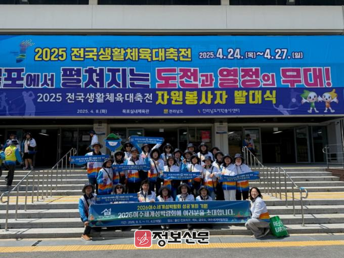 ![]() 여수시(시장 정기명)는 지난 8일 목포실내체육관에서 개최된 2025전국생활체육대축전 자원봉사자 발대식에 참가해 2026여수세계섬박람회 홍보활동(캠페인)을 전개했다. |