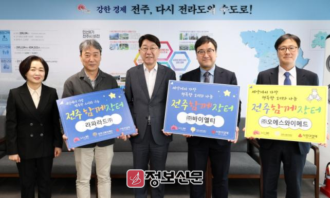 전주시는 지난 8일 △라파라드(대표 임영경) △바이엘티(대표 강상민) △오에스와이메드(대표 이세철) 등 전주지역 3개 바이오기업과 전주형 착한 소비자 운동인 ‘전주함께장터’ 프로젝트 성금 전달식을 가졌다.