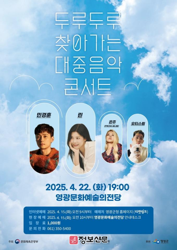 문화체육관광부가 주최하고 한국대중음악공연산업협회가 주관하며 영광군이 후원하는 이번 공연은 다양한 장르의 가수들이 한자리에 모여 관람객들에게 새로운 음악적 경험을 선사하며 모든 세대가 공감하고 소통하는 음악의 향연이 펼쳐질 것으로 기대된다.