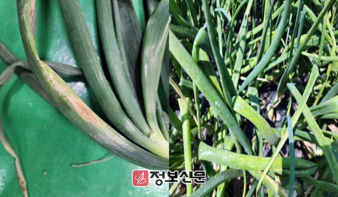 ![]() 나주시가 봄철 마늘·양파 병해충 피해 예방을 위한 농가에 철저한 방제를 당부하고 나섰다. 사진은 양파에서 발생하는 노균병(좌), 잎마름병(우). (사진제공-나주시) |