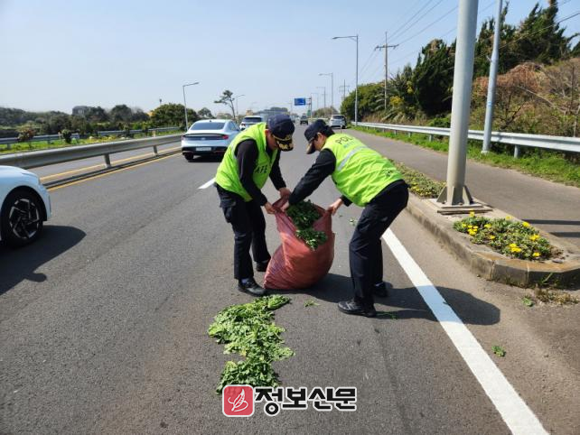 이날 평소와 같이 해안선 순찰을 실시하던 중 일주도로를 막고 차량통행을 방해하던 대형 포대를 발견한 해안1경비대 소속 경감 고승지 등 직원들은 그냥 지나치지 않고 즉시 도로방치물을 갓길로 이동시켜 대형교통사고의 위험을 방지하는 활동을 실시했다.