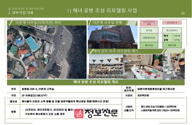 이번 고도화사업 공모에는 전국 총 18개 어촌체험휴양마을이 신청하였으며, 외부 전문가가 포함된 선정위원회의 평가를 통해 4개 마을을 최종 선정하였으며, 도내에서는 법환동어촌계(어촌계장 고승철)가 제주 전통의 해녀문화와 해안 생태자원을 기반으로 한 독창적인 체험 콘텐츠를 제안하였으며, 특히 ▲해녀문화 연계 소품제작 체험공간(공방) 및 해녀 북카페 조성 ▲게스트하우스 리모델링하여 방문객 편의시설 개선 등 지역 자원을 활용한 지속가능한 어촌관광 모델을 제시한 점이 높은 평가를 받았다.