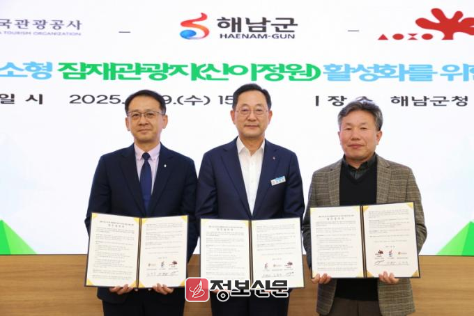 ![]() 해남 산이정원, 관광공사 강소형 잠재관광지 활성화 업무협약 체결(좌로부터 김완수, 명현관, 이병철) |