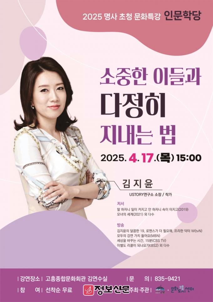 이번 강연은 인간관계에서의 갈등을 최소화하는 적절한 사과법, 잡담과 공감의 기술, 친화력 높이는 화법 등을 다루며, 고흥군민의 문화 향유권 신장과 인문학적 소양을 넓히기 위해 마련됐다.