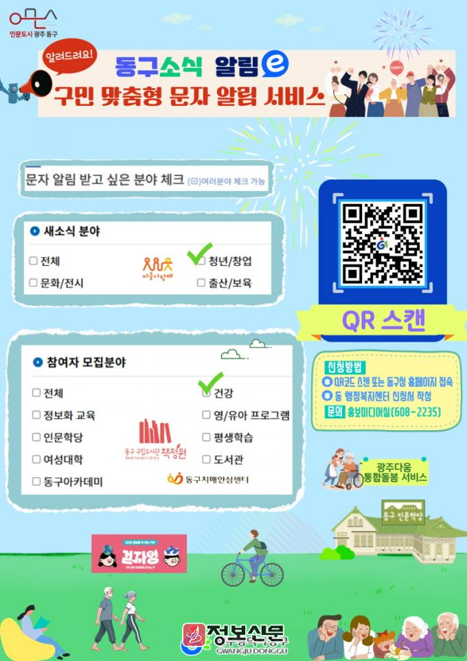 서비스 신청은 거주지 각 동 행정복지센터 방문 또는 동구청 누리집 접속을 통해 간편하게 가능하며 신청 이후에는 관심 분야에 대한 관련 소식을 문자로 빠르게 받아볼 수 있다. 기타 궁금한 사항은 홍보미디어실 정보통신팀(☎062-608-2235)으로 문의하면 된다.