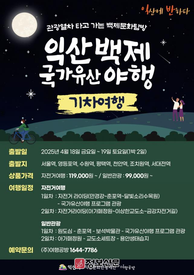 이번 관광상품은 오는 4월 18~19일 운영되며, 일반 관광객 180명과 자전거 여행객 60명을 모집한다. 관광객들은 전용 열차를 타고 익산에 도착한 후 지역 명소 둘러보고 아름다운 야경을 즐길 수 있다.