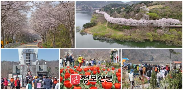 옥정호 순환도로 변에 벚꽃이 만개한 가운데 붕어섬 생태공원에도 봄꽃들이 활짝 피면서 관광객 탄사가 쏟아진다.