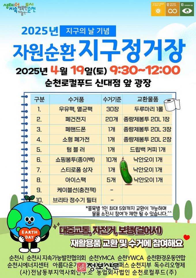 행사 당일 순천로컬푸드 신대점 앞에서는 자원순환 지구 정거장을 운영하여 우유팩, 멸균팩, 폐건전지, 폐핸드폰, 소형 폐가전, 쇼핑봉투(종이가방), 아이스팩 등을 종량제 봉투(20L), 두루마리 휴지, 지역 농산물(오이)로 교환하고 안쓰는 텀블러, 스티로폼 상자를 기부받아 지역 내 노플라스틱 카페와 순천로컬푸드(주)에 기증하여 공유 자원으로 활용할 계획이다.
