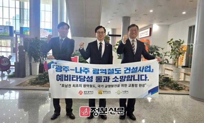 ![]() 고광안 광주광역시 행정부시장(가운데), 명창환 전남도 행정부지사(오른쪽), 안상현 나주부시장(왼쪽)이 11일 광주 김대중컨벤션센터에서 열린 제5차 광역교통 시행계획(광주·전남권) 간담회에 참석해 ‘광주-나주 광역철도사업’ 예타 조사 통과를 촉구하는 현수막 퍼포먼스를 하고 있다. (사진제공-나주시) |